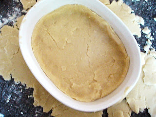 Mix your ingredients together. Place your dough on a floured surface and roll it out. I used white corning ware for my 'pie pan'. (Deeper dishes = more filling) Place your crust inside.